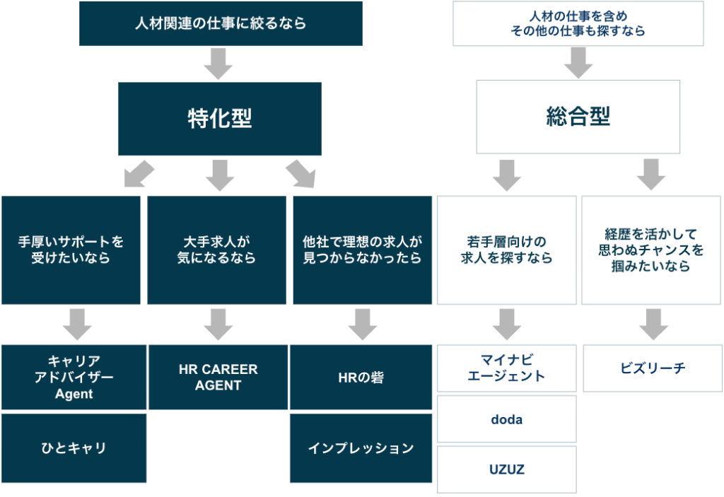 まずは、自分に合う人材業界の転職エージェントを探すために、以下のフローチャートで見てみましょう。